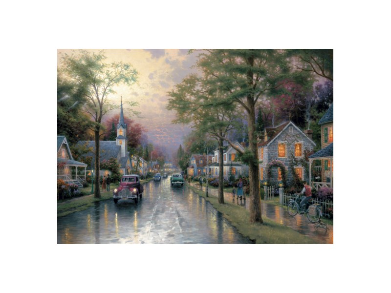 Dass auch in einem verregneten Tag die Poesie des Augenblicks steckt, beweist Thomas Kinkade in seinem Bild 'Morgen in der kleinen Stadt'