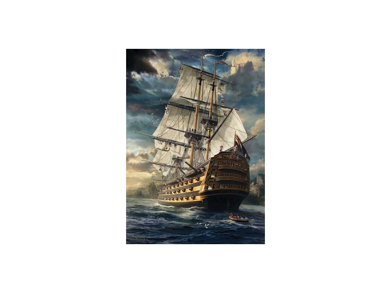 Dieses Puzzle mit 1.000 Teilen zeigt ein Gemälde mit Schiff auf stürmischer See.