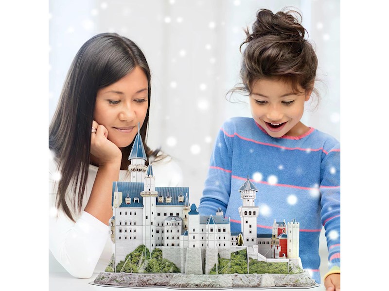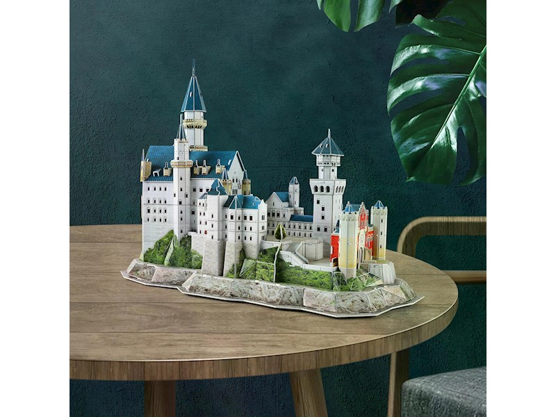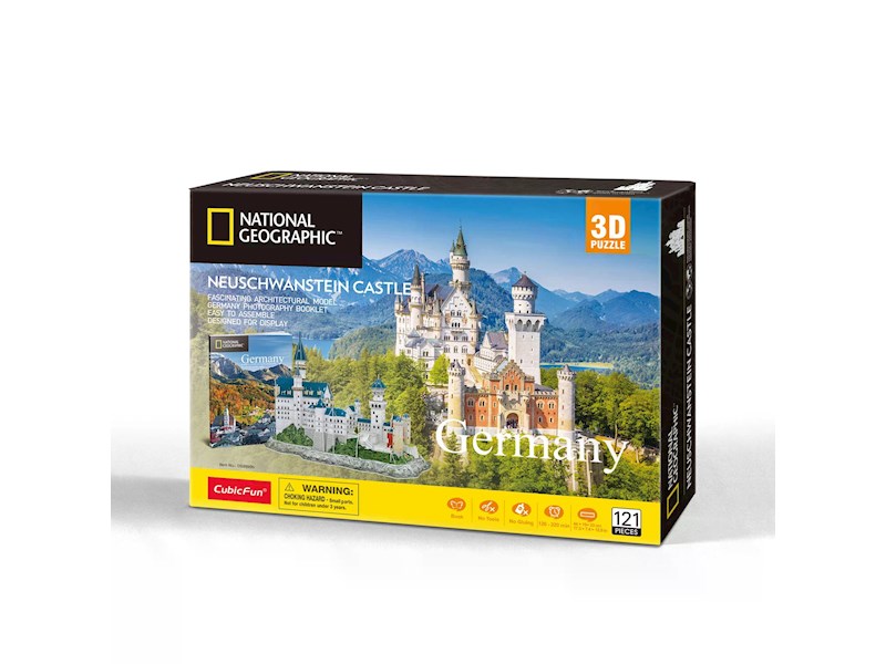 Mit diesem 3D Puzzle von CubicFun kann ohne Leim und Schere das beliebte Wahrzeichen Schloss Neuschwanstein als 3D Modell nachgebaut werden. Die bebilderte Anleitung führt Schritt für Schritt zum fertigen 3D Puzzle. Die hochwertigen Teile lassen auch mehrfaches Aufbauen zu. Zusammen mit dem beliegenden Heft von National Geographic wird daraus eine Reise nach durch Deutschland. Höhe: 33cm.