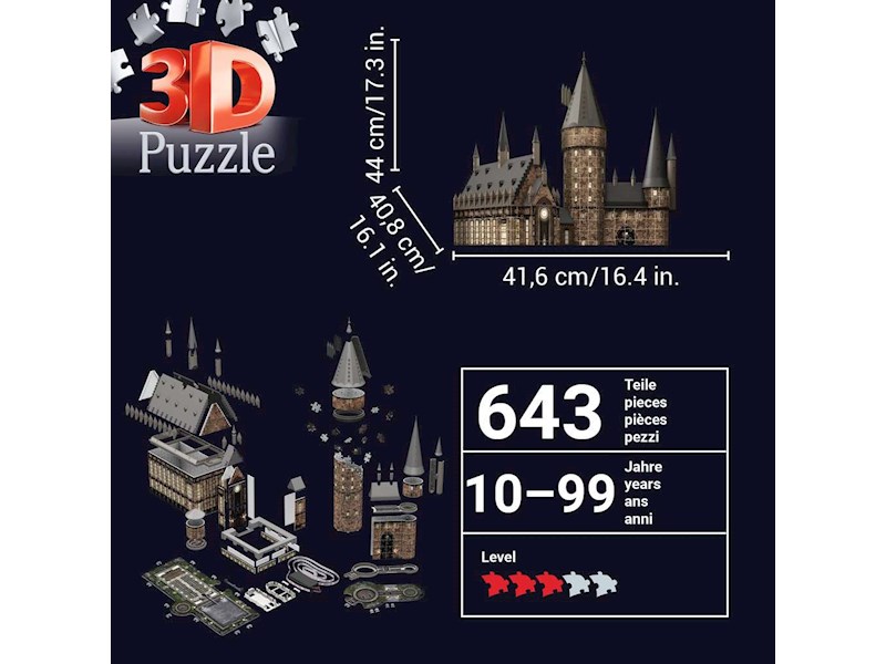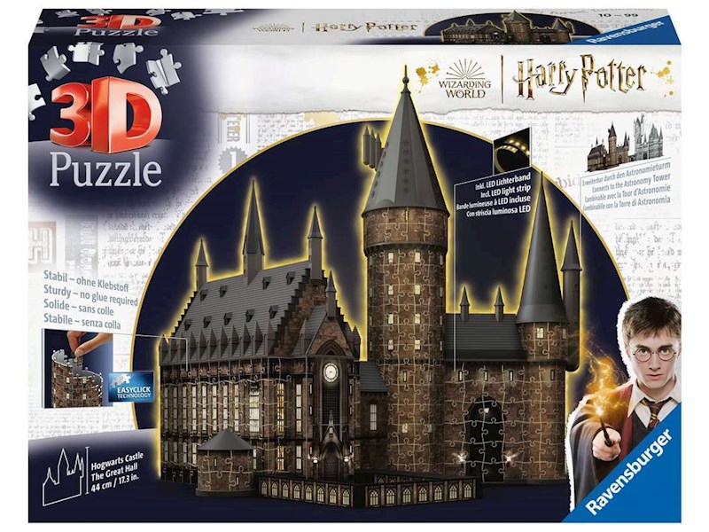 Mit den beleuchteten Ravensburger 3D Puzzles können kleine und grosse Harry-Potter-Fans die Grosse Halle aus jeweils 540 hochwertigen Kunststoff-Puzzleteilen und zahlreichen Zubehörteilen Stück für Stück zusammensetzen.