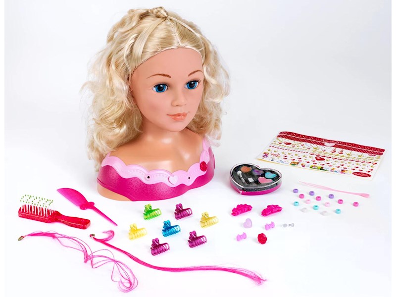 Frisierkopf mit wasch- und kämmbarem Haar. Kosmetikset (dermatologisch getestet) mit Lip- gloss, Lidschatten und Rouge. Bürste und Kamm mit Haarperlenset, 2 Haarsträhnen, 7 Haarclips, 2 Barette Clips. 8 Deko Pins, Sticker und Tipps.