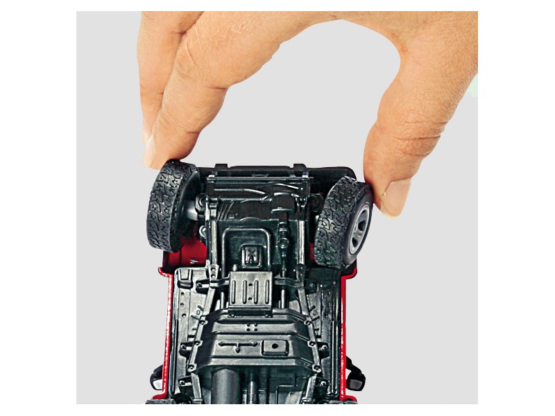 Der Jeep ist wie sein grosser Bruder mit einer Achsschenkellenkung ausgestattet. Die Achsen sind federnd gelagert. Türen und Motorhaube sind zum Öffnen. Das Modell ist über das Lenkrad steuerbar und besteht fast vollständig aus Metall.