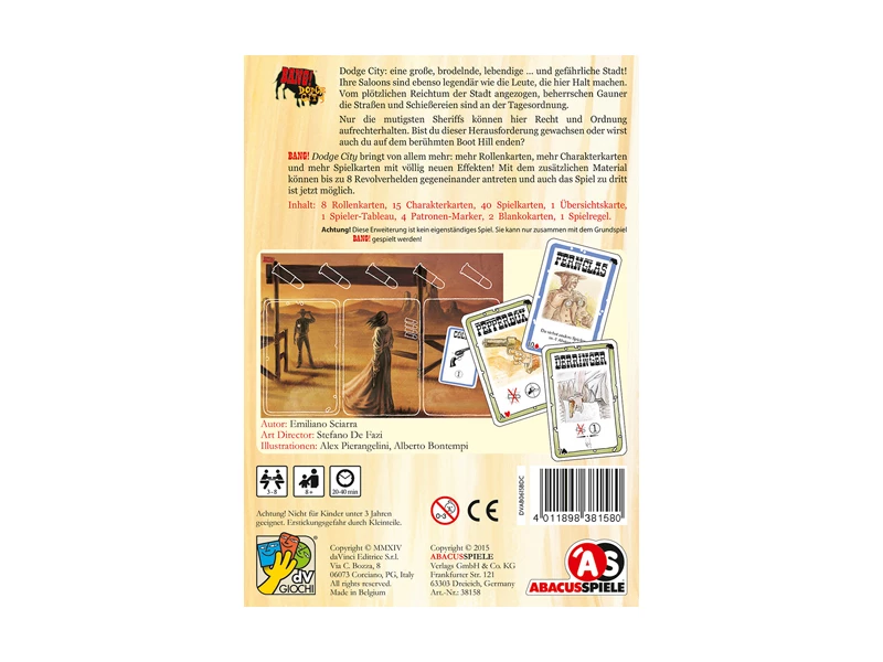 Dodge City: eine grosse, brodelnde, lebendige ... und gefährliche Stadt! Ihre Saloons sind ebenso legendär wie die Leute, die hier Halt machen. Vom plötzlichen Reichtum der Stadt angezogen, beherrschen Gauner die Strassen und Schiessereien sind an der Tagesordnung. Nur die mutigsten Sheriffs können hier Recht und Ordnung aufrechterhalten. Bist du dieser Herausforderung gewachsen oder wirst auch du auf dem berühmten Boot Hill enden? BANG! Dodge City bringt von allem mehr: mehr Rollenkarten, mehr Charakterkarten und mehr Spielkarten mit völlig neuen Effekten! Mit dem zusätzlichen Material können bis zu 8 Revolverhelden gegeneinander antreten und auch das Spiel zu dritt ist jetzt möglich.