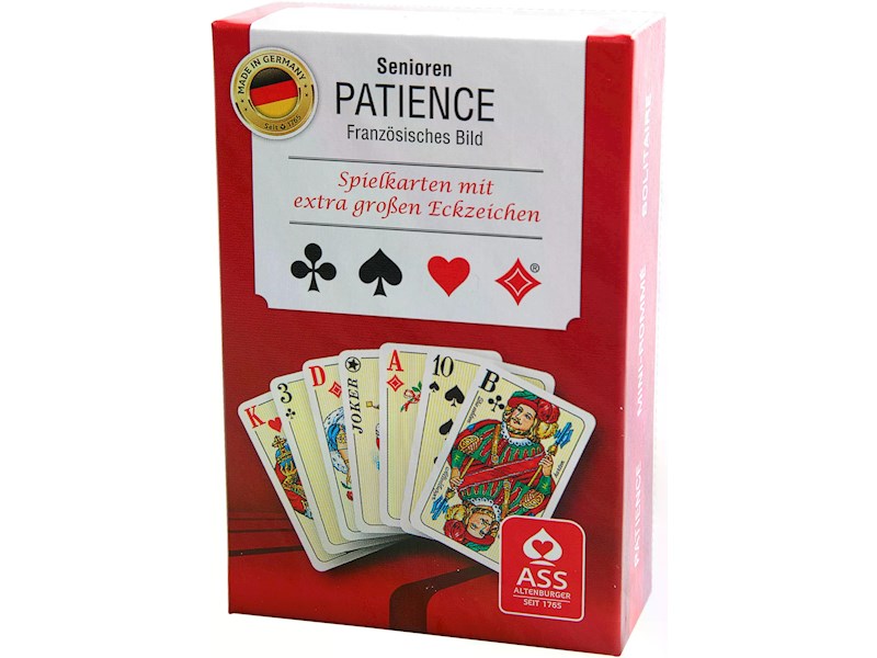 Patiencen legen gehört für viele Kartenspieler zu den beliebtesten Solo-Freizeitbeschäftigungen - das besondere Extra des Senioren-Patience: Die Karten sind besonders gut lesbar durch die extra grossen Eckzeichen. 2 x 55 Blatt mit dem französischen Bild sind hier verpackt in einem praktischen Folienetui und können auf Grund der praktischen Grösse überall mit hin genommen werden.