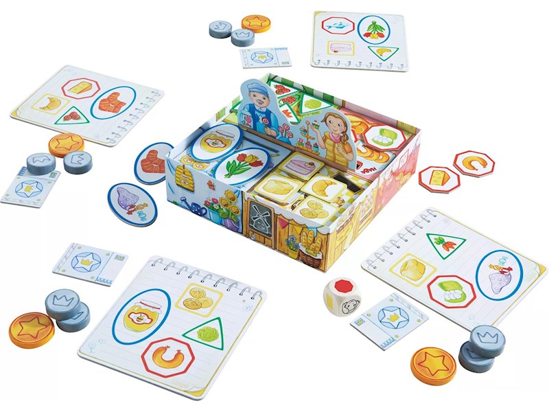 Auf geht’s zum Markt. Jeder hat eine Einkaufsliste mit vier Dingen, die er besorgen soll. Doch wo gibt es die Brötchen und welcher Marktstand verkauft den Käse? Wie viel kosten die Socken und gibt es noch leckere Erdbeeren? Was kann man mit dem grossen Schein alles kaufen? Der Würfel bestimmt, an welchem Marktstand als Nächstes eingekauft werden darf. Ausserdem können Kinder mit dem Spielmaterial frei spielen und viele Rollenspiele rund ums Einkaufen ausprobieren.