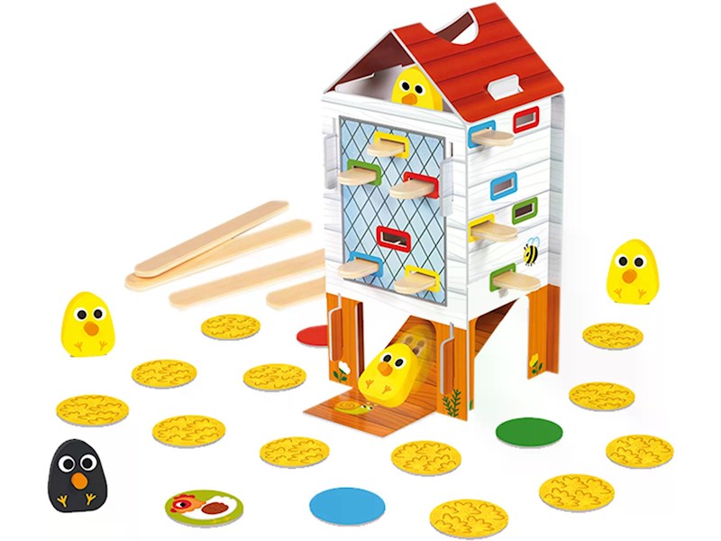 Die fröhlichen Küken spielen im Hühnerstall Verstecken. Zieht die Stäbchen heraus, um sie zu finden! - 5 Holzküken, 12 Stäbchen, 1 Hühnerstall, 16 Plättchen.