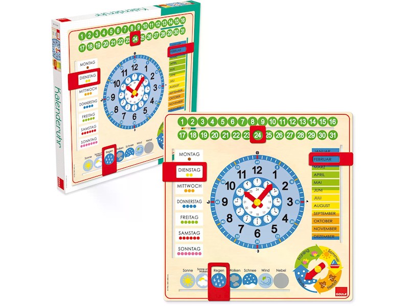 Spielend lernen Kinder den Umgang mit Monaten, Jahreszeiten, Wetter, Tagen, Stunden und Minuten. Die eingebauten beweglichen Teile können nicht verloren gehen und sind genau auf die Handhabung der Kleinen ausgelegt.