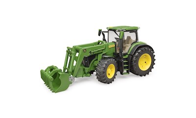 Eine moderne Landwirtschaft ist ohne moderne Traktoren gar nicht mehr vorstellbar. Da die Arbeit der Landwirte nicht nur vielschichtig, sondern auch voller Herausforderungen ist, brauchen sie die richtige Technik. Traktoren der Serie 7R von John Deere verbinden ein geringes Gesamtgewicht mit hohen Leistungen. Dieser agile Traktor beschleunigt nicht nur Transporte, sondern bringt jeden Betrieb voran. Dieser wichtige Traktor ist neu bei BRUDER in der Themenwelt Landwirtschaft zu finden. Getreu dem BRUDER-Motto „Just like the real thing“ ist der Traktor mit vielen, realistischen Details ausgestattet. Die Motorhaube öffnet sich und zeigt den imposanten Motor. Türen sind zu öffnen und bieten den optional erhältlichen bworld Figuren Platz in einer modernen Kabine. BRUDER-typisch ist die ausgezeichnete Steuerbarkeit und Fahrkomfort durch die eingebaute Pendelachse und die durch das Schiebedach einsetzbare Lenkverlängerung. Durch die höhenverstellbare Heckkupplung können alle Anhänger der Profiserie benutzt und durch den vorhandenen Frontlader auch gleich beladen werden. Alle Anhänger aus dem landwirtschaftlichen Sortiment von BRUDER können an diesen Traktor montiert werden.