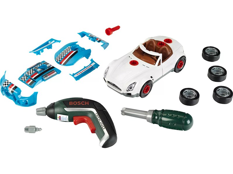 Spielzeug Set mit kindgerechten Funktionen. Inhalt: Bosch Akkuschrauber Ixolino II batteriebetrieben mit auswechselbaren Aufsätzen, zerlegbares Bosch Auto mit 6 Tuning Zubehörteilen, 4 auswechselbaren Reifen und 3 Etikettensätzen.