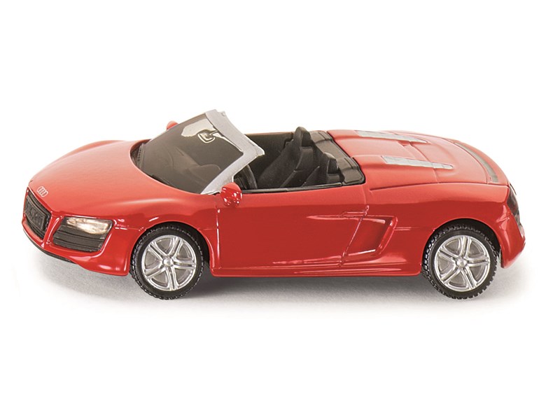 Cabrio-Version des Audi-Supersportwagens R8. Ultrabreite Reifen auf Sportfelgen. Karosserie aus Metall. Scheinwerfer an Front und Heck aus Kunststoff.
