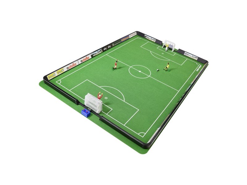 Das grosse Spielfeld besteht jetzt aus phtalatfreiem Filz, es ist rutschfest, ideal für weite Pässe und präzise Schüsse. Begrenzt wird das Spielfeld von einer zusammensteckbaren Bande, die als Werbeshow im kleinen das Suchen nach