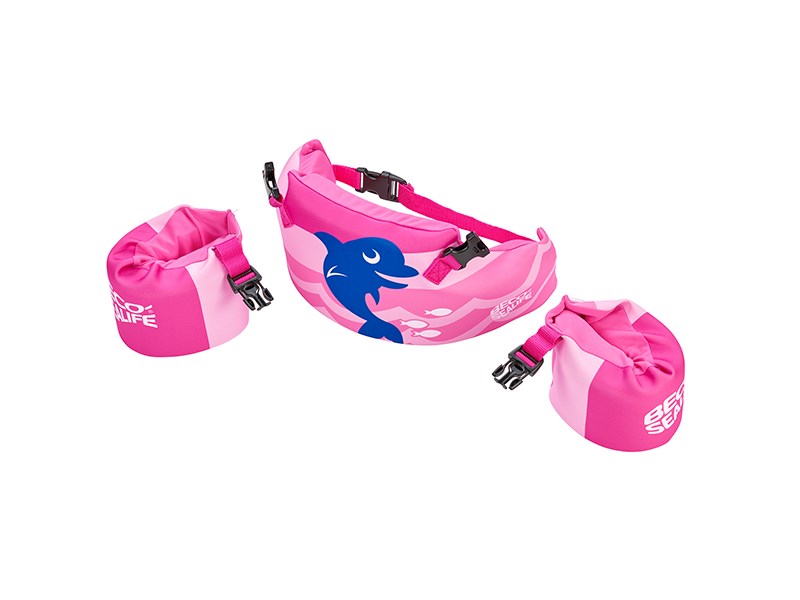 Schwimm-Lern-Set bestehend aus Schwimmhilfen und Schwimmgürtel, die mit einem Sicherheitsverschluss kombiniert werden (auch einzeln anwendbar). Das Set garantiert den richtigen Auftrieb an der optimalen Position. Für Kinder von 2 bis 6 Jahren und einem Körpergewicht von 15 bis 30 kg. Zertifiziert nach den aktuellen europäischen Sicherheitsrichtlinien EN13138-1:2014. ACHTUNG: Kein Schutz vor Ertrinken. Nur unter Aufsicht eines Erwachsenen verwenden!!!