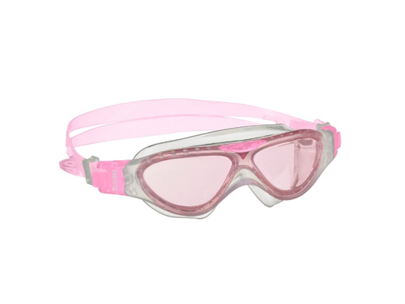 Panoramaschwimmbrille mit breiter Dichtung für eine perfekte Passform. UV-Schutz und Antibeschlag. Doppeltes hochelastisches Kopfband mit seitlichem Schnellverschluss. Linsen aus Polycarbonat, Dichtung, Rahmen und Kopfband aus Silikon.